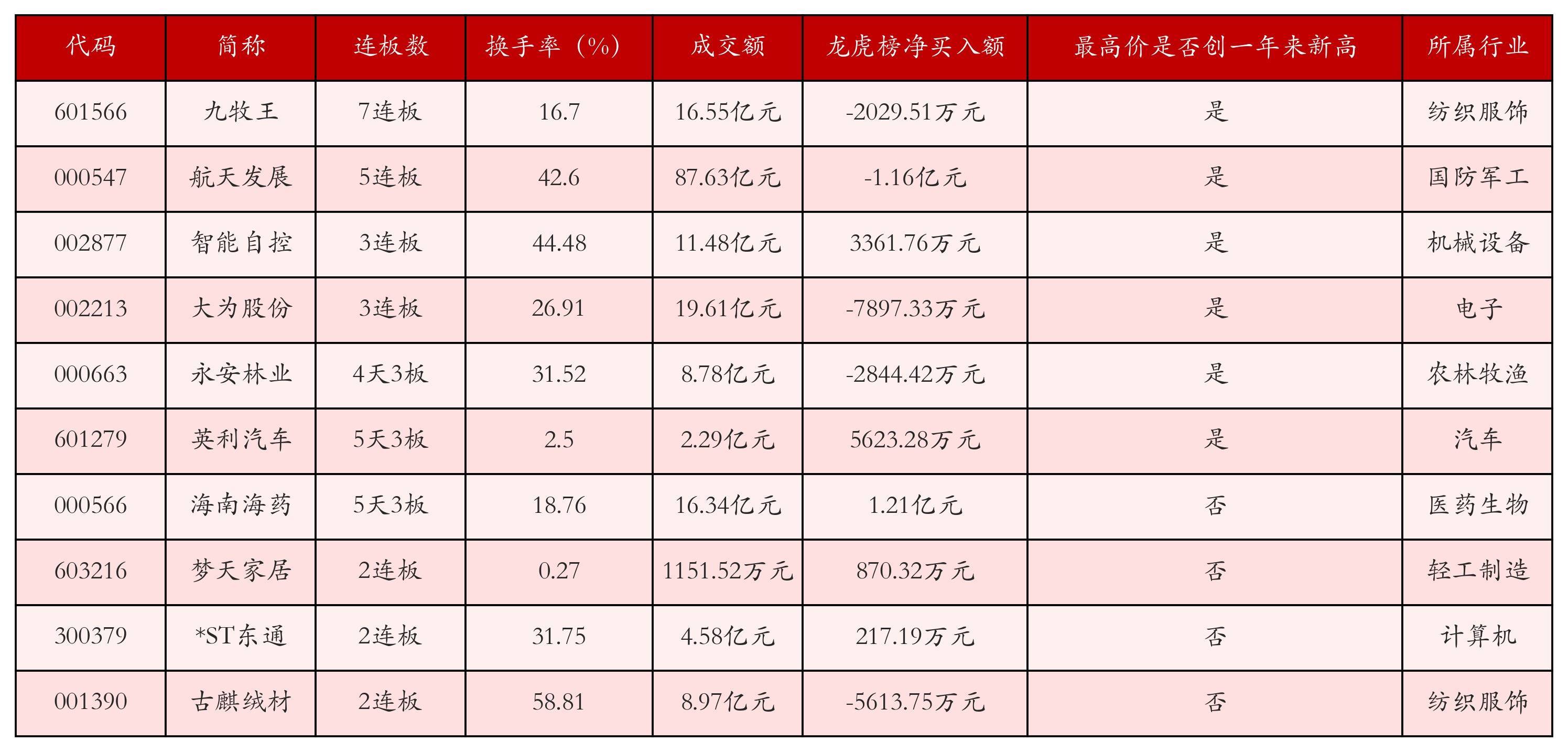 截至11月20日收盘,上证综指下跌0.4%,收于3931.05点,深证成指下跌0.76%,收于12980.82点,创业板指下跌1.12%,收于3042.34点。今日沪深两市A股共计49只涨停,综合当前连板数以及当日龙虎榜数据,其中较为强势的前三只个股分别为:九牧王(601566)、航天发展(000547)与智能自控(002877)。今日强势个股前10位具体数据见下表: