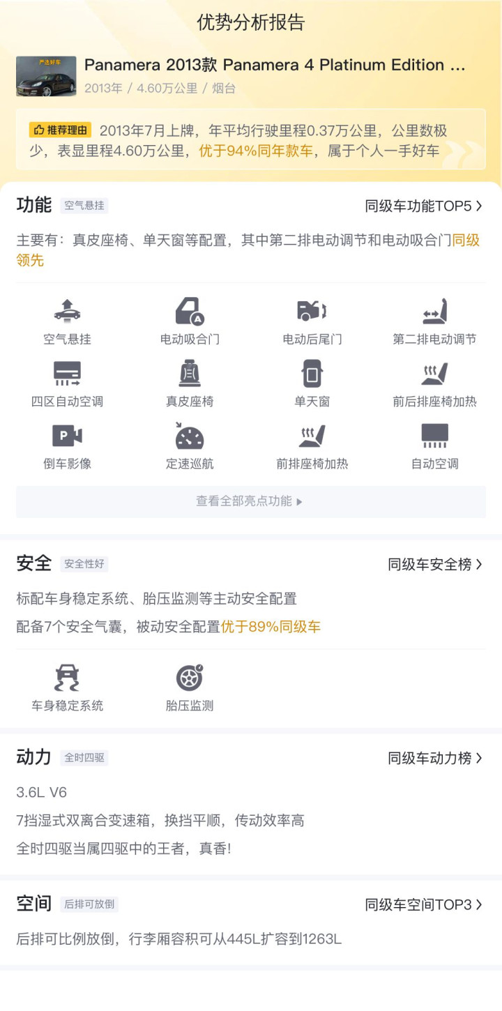 这辆保时捷Panamera 2013款 Panamera 4 Platinum Edition 3.6L在配置、动力、空间等方面均表现出色。一键启动、电动后尾门等配置提升了使用的便捷性和舒适性;3.6升V6发动机和7速PDK双离合变速器提供了出色的动力性能和加速体验;宽敞的行李舱容积满足了各种装载需求。同时,它也存在一些不足之处。例如,后排座椅的舒适性和支撑性可能不尽如人意,长时间乘坐可能会感到不适;部分车主反映车辆的悬架较硬,在颠簸路面上的乘坐舒适性有待提升;此外,作为一款高性能豪华轿车,其燃油经济性相对较低,日常使用成本较高。